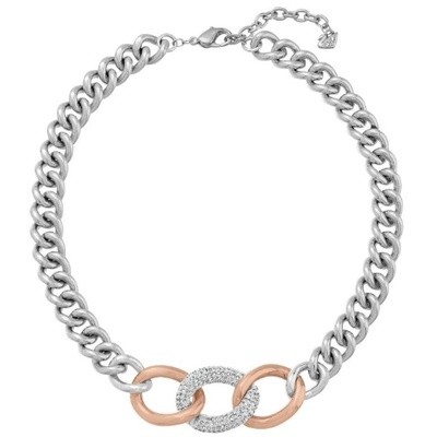 スワロフスキー『Bound ネックレス』です。今シーズン注目のボリュームのある太チェーンをあしらったネックレス。ステンレスのチェーンと、ローズゴールドとパラジウムコーティングをミックスさせたトレンドのグルメットチェーンを使用しています。中央のリングにはクリスタルのパヴェを施しています。