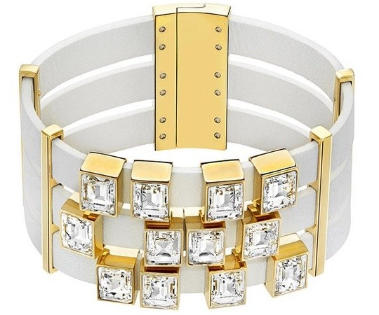 スワロフスキー『Element White ブレスレット』です。ホワイトのソフトレザーストラップに、スライドするスクエアカットのクリアクリスタルを通したブレスレット。ゴールドPVDメタルの装飾や光沢のあるマグネットクロージャーが旬な雰囲気を感じさせます。 カジュアルで都会的なデザインを魅惑的に輝かせた、シックなデザインです。 他のブレスレットやカフスボタンとの重ねづけ、リラックス感のあるサマースタイルやカラーをリンクさせたレイヤードスタイルにもオススメです。