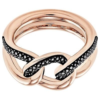 スワロフスキー『LANE モチーフのあるリング』です。グルメットチェーンのモチーフが存在感のあるリング。光沢のある表面の半分にちりばめたブラックのパヴェとローズゴールドPVDのメタルが美しいコントラストがあるジュエリーは、様々なシーンにもクールでロマンチックな雰囲気を与えてくれます。お手持ちの別のデザインのリングと合わせれば重ねづ件スタイルとしても、単独では繊細なルックを与えてくれます。