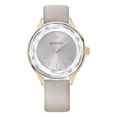 スワロフスキー『Octea Nova ウォッチ』です。きらめきながら時を知らせる洗練されたデザインのウォッチ。ひとつのサファイアクリスタルから作られたベゼルとガラスに、スワロフスキーの技術が際立ちます。約68面のファセットが施され、普段のおしゃれにきらめきを添えるアイテム。ケース:ローズゴールドトーンコーティング・ステンレススチール/文字盤:グレーのサンレイ/ストラップ:レザー/フェイス直径:約36mm スイス製