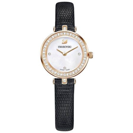 スワロフスキー 『Aila Dressy Mini ウォッチ』です。デイリーな装いを上品に演出する繊細なデザインのウォッチ。お手持ちのジュエリーとの重ねづけもしやすい、一瞬で魅力的なルックを作ってくれるアイテムです。ケース:42個のクリスタル付ローズゴールドカラーコーティング・ステンレススチール/ラグ:2個のクリスタル付/文字盤:3個のクリスタル付マザーパール/ストラップ:リザード型押しレザー/フェイス直径:25 mm/30m防水/スイス製