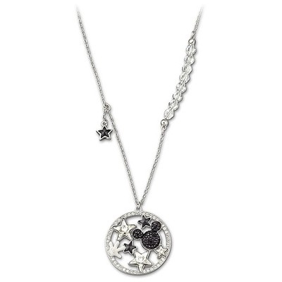 スワロフスキー 『Mickey ペンダント』です。ディズニーの古典的なキャラクターを抽象的に表現。ミッキーの頭のシルエットにはポインティアージュョ技法でジェットクリスタルを施し、クリスタルの星をあしらっています。クリスタルビーズを飾ったチェーン。ロジウムコーティング。
