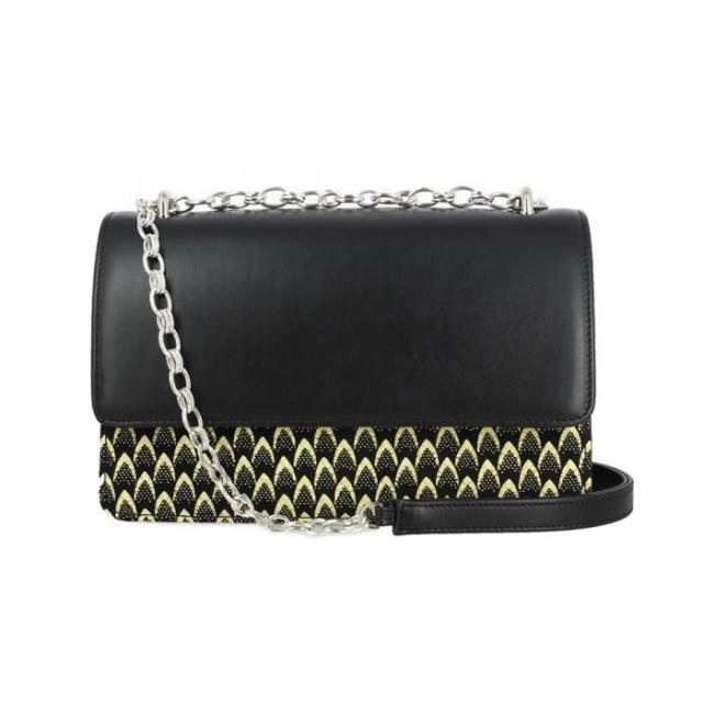 Philippe Audibert『SIDIKA Porto Novo ピアス ブラック』です。デザイナーがアフリカからインスピレーションを得て作ったバッグ。ワックスプリントとバイロンチェーンを組み合わせたデザインです。シルバーカラーのチェーンとブラックレザーのストラップ、押しボタンロックです。
