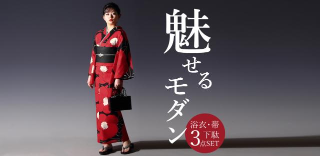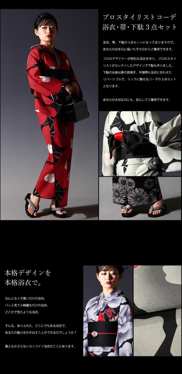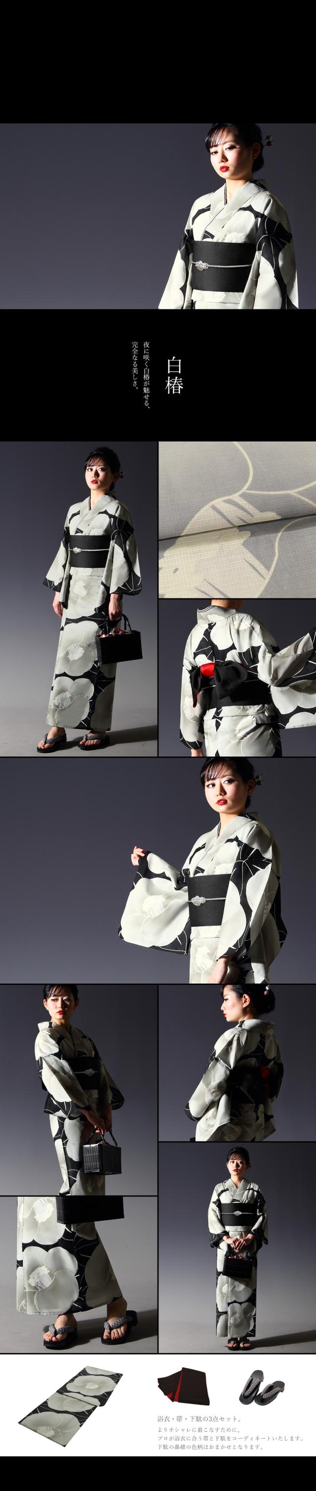 浴衣3点セット(浴衣+帯+下駄) 選べる柄 モダン レディース フリーサイズ 浴衣セット 古典 椿 赤 黒 白 生成り