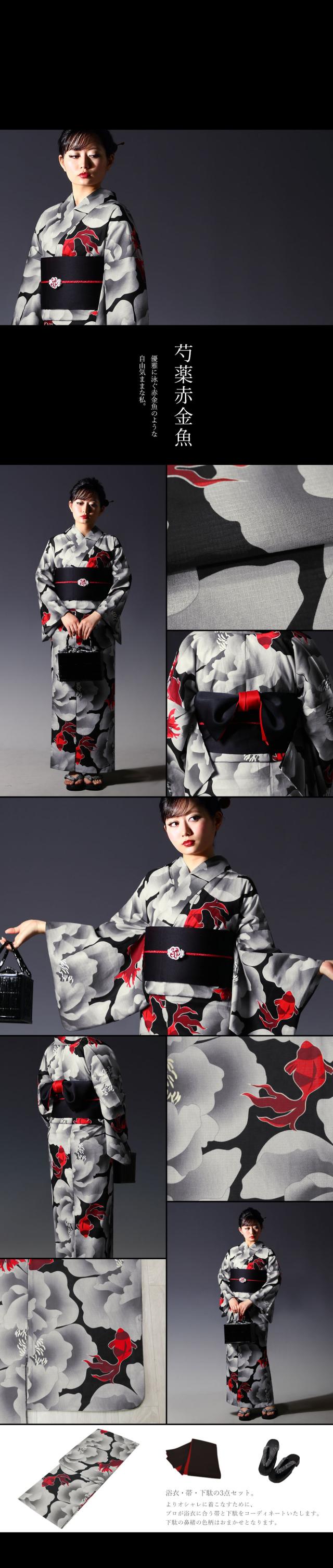 黒(ブラック)、赤(レッド)、白(ホワイト)・生成りを基調としたシックでかっこいい浴衣、帯、下駄の3点セット。