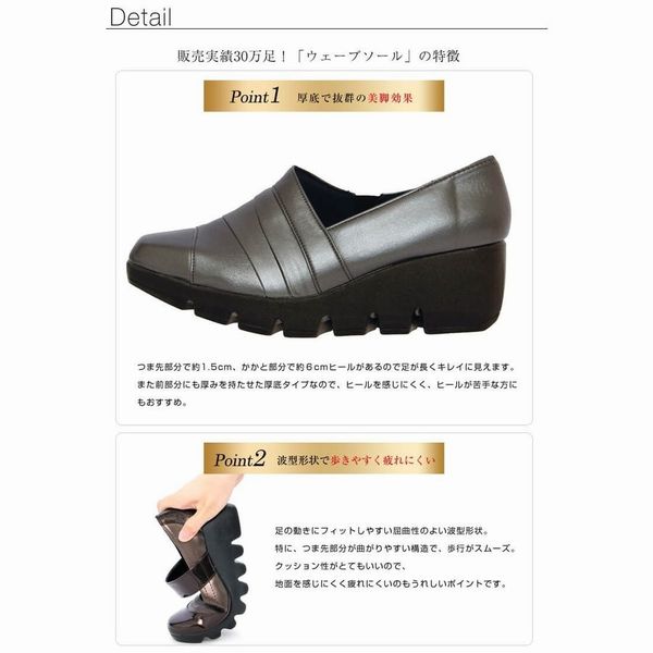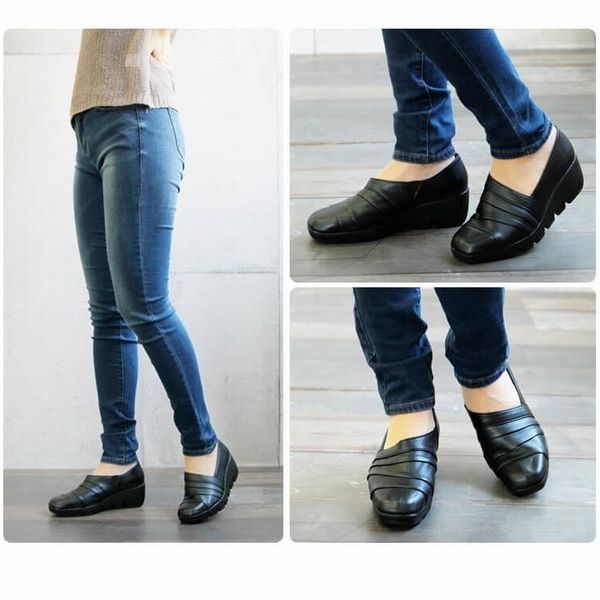 | 安心の日本製コンフォートシューズ。 甲をすっぽりと覆うデザインで、ほどよいフィット感があります。 ウェーブソールで滑りにくく、歩きやすいので、近所履きにもお出かけにもおすすめです。 つま先はゆるやかなスクエアトゥで、ラウンドトゥよりすっきり見えますが、窮屈感はあまりありません。 レザーを巻きつけたような切り替えがポイント。 かかとは型崩れしないよう丁寧に縫製されていて、サイドはゴム入りで履きやすい仕様に。 |