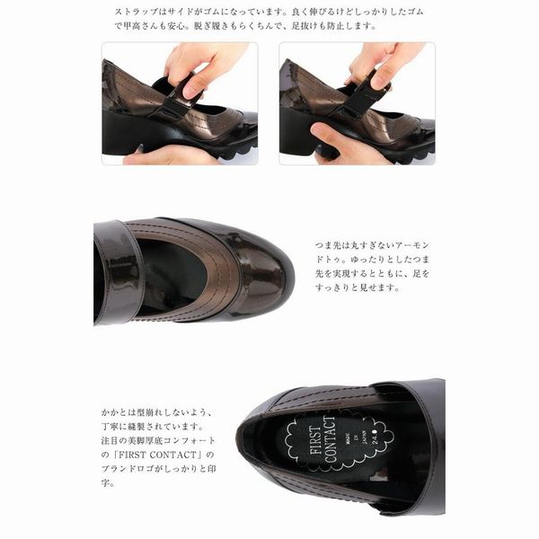 | 安心の日本製コンフォートシューズ。 太めのストラップが、しっかり足をホールドし、フィット感抜群。 サイドがゴムになっていて、よく伸びるけどしっかりしたゴムで甲高の方でも安心。 着脱簡単で、足抜けも防止。 つま先は丸過ぎないアーモンドトゥで、ゆったりとしたつま先を実現するとともに足をすっきりと見せます。 かかとは型崩れしないよう丁寧に縫製されています。 |