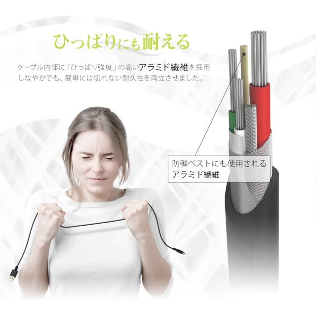 ケーブル内部に耐久性を高める防弾チョッキなどに使用されているアラミド繊維を採用し15,000回の