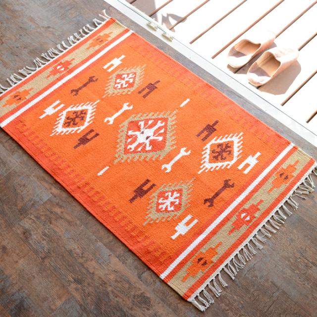 独特の幾何学模様と鮮やかな色使いで、お部屋にエスニック要素をお洒落にプラスしてくれます。コットン100%製の丈夫な生地で、季節を問わず使えるのも◎!ベッドサイドや玄関先に敷いて、お部屋のアクセントアイテムとしても活躍してくれます。