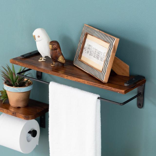 ウォールシェルフ タオルハンガー ウォールラック 棚 木製 アイアン 天然木 タオル掛け ハンガー 鉄製 シンプル アンティーク調