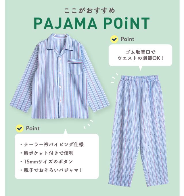 肌にやさしい綿100%がいいね ♪ 肌に直接触れるものだから、安心の天然素材でつくりました。 すっきりとした薄手の生地は軽く風通しもよく、 サラリとした肌触りが気持ちのいいパジャマです。 爽やかなカラーのシンプルかっこいいストライプ柄パジャマです。 このパジャマはメンズサイズや子供サイズも販売しており、おそろいリンクコーデが楽しめます。 ▼ 同柄長袖パジャマ ▼ ⇒ 同柄長袖 男の子 130-160cm はこちら ⇒ 同柄長袖 MENS M・L・LL はこちら ⇒ 同柄長袖 MENS 3L・4L・5L はこちら ▼ 同柄半袖パジャマ ▼ ⇒ 同柄半袖 男の子 150-160cm はこちら ⇒ 同柄半袖 MENS M・L・LL はこちら ⇒ 同柄半袖 MENS 3L・4L・5L はこちら |