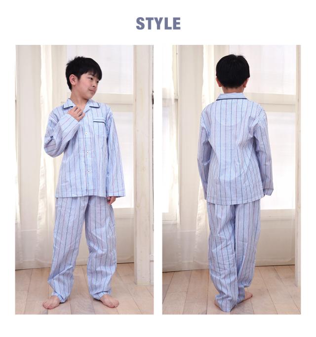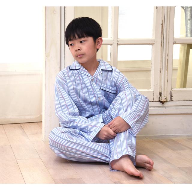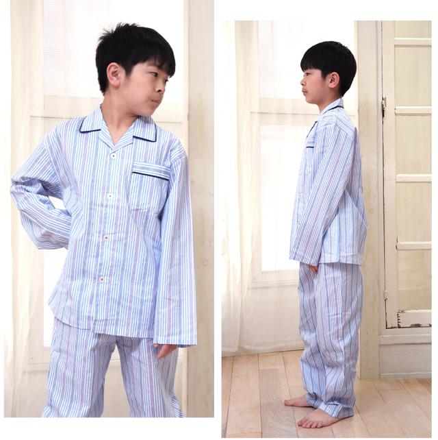 パジャマ キッズ 男の子 綿100% 長袖 春 夏 初秋 前開き ボタン ストライプ柄 薄手のシャツ ブルー グレー 130 140 150 160 子供 ジュニア ボーイズ 家族 おそろい リンクコーデ メール便なら 送料無料 75111