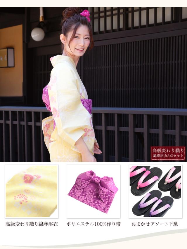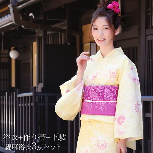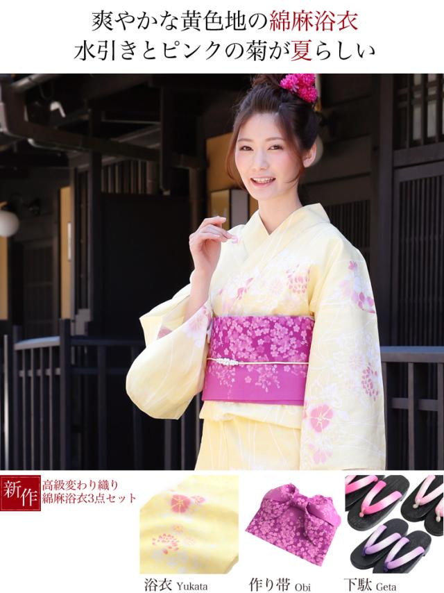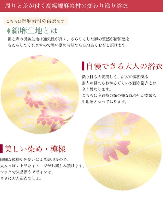 浴衣 セット 作り帯 レディース レトロ 大人 高級変わり織り綿麻浴衣3点セット「黄色地に花玉と水引」 浴衣 イエロー 古典 花柄
