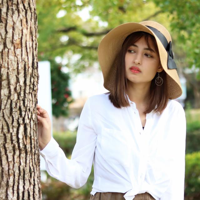 春夏 折りたたみ可能 オリジナル つば広レディースハット リボン 麦わら帽子 HAT 帽子 ストローハット レディース モカ