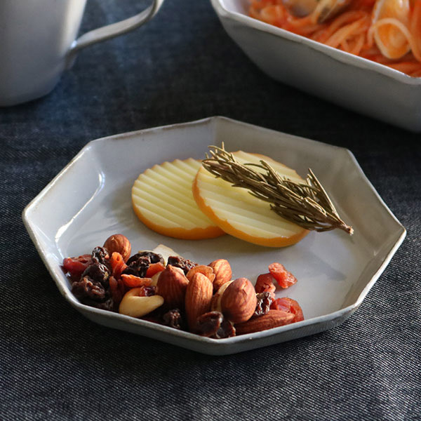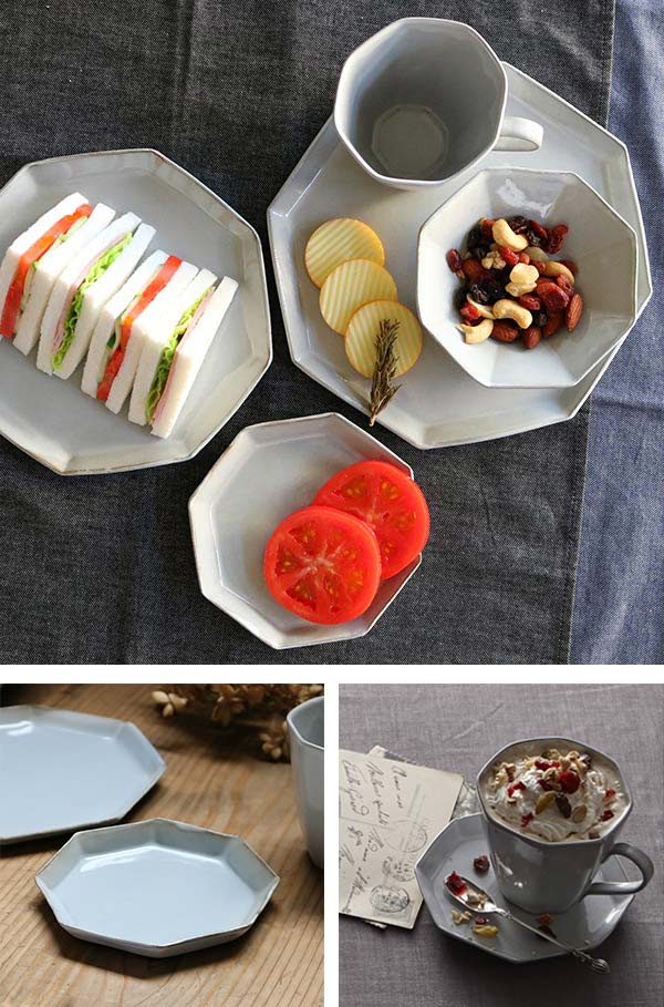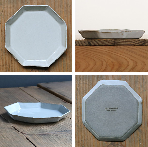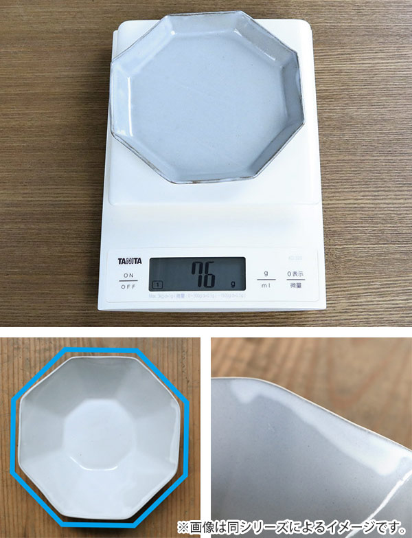 手仕事ならではの不揃いな八角形が優しい雰囲気をかもしだしています。手に持つととても軽く扱いやすい器です。どんな食卓にも合わせやすい光沢のあるグレーカラーで見た目にも高級感があります。