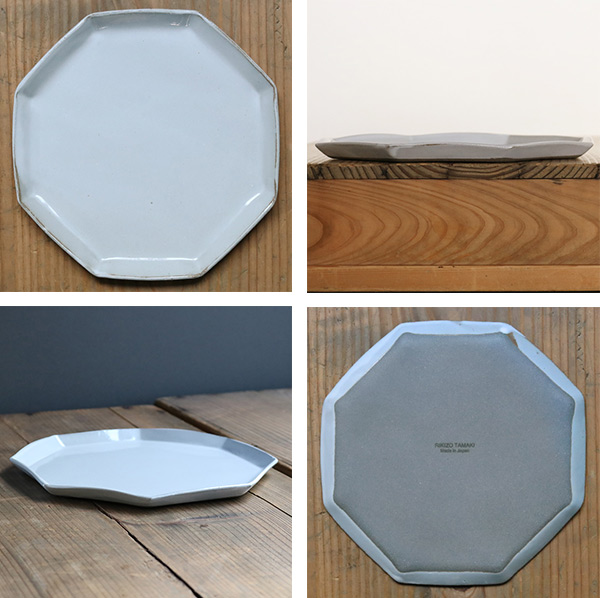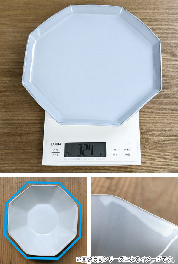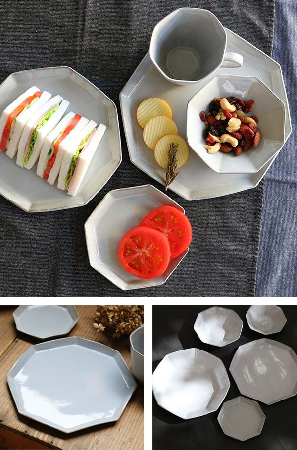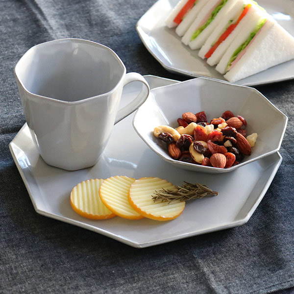 手仕事ならではの不揃いな八角形が優しい雰囲気をかもしだしています。手に持つととても軽く扱いやすい器です。どんな食卓にも合わせやすい光沢のあるグレーカラーで見た目にも高級感があります。