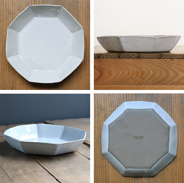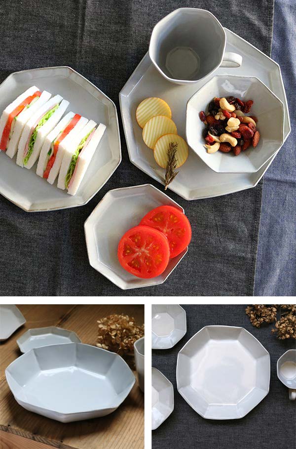 手仕事ならではの不揃いな八角形が優しい雰囲気をかもしだしています。手に持つととても軽く扱いやすい器です。どんな食卓にも合わせやすい光沢のあるグレーカラーで見た目にも高級感があります。
