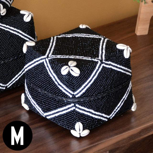 手作業で竹のスライスを編み、贅沢に底以外の全面をビーズでデコレーションした、華やかなアイテムです。大切な物を中にしまって「見せる収納」に。