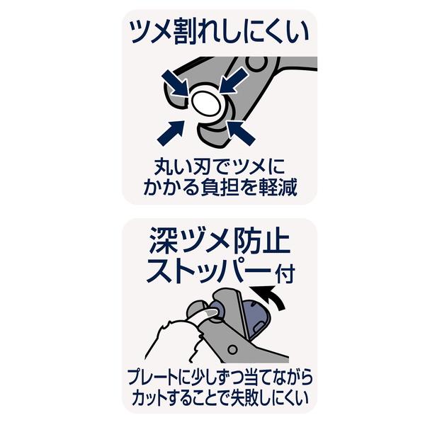 ●ツメ割れしにくい:丸い刃でツメにかかる負担を軽減●深ヅメ防止ストッパー付:プレートに少しずつ当てながらカットすることで失敗しにくい