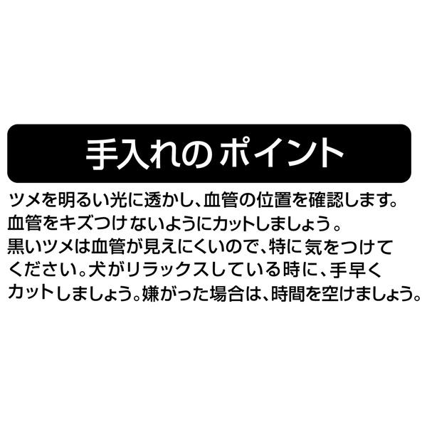<手入れのポイント>ツメを明るい光に透かし、血管の位置を確認します。血管をキズつけないようにカットしましょう。黒いツメは血管が見えにくいので、特に気をつけてください。犬がリラックスしている時に、手早くカットしましょう。嫌がった場合は、時間を空けましょう。