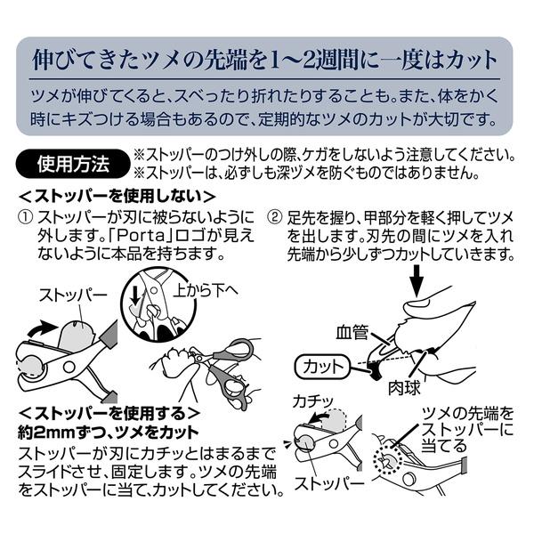 <ストッパーを使用しない>1.ストッパーが刃に被らないように外します。「Porta」ロゴが見えないように本品を持ちます。2.足先を握り、甲部分を軽く押してツメを出します。刃先の間にツメを入れ先端から少しずつカットしていきます。