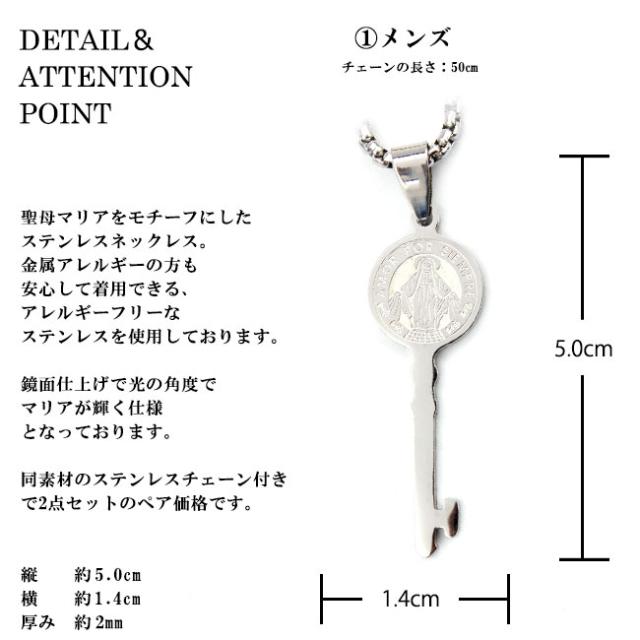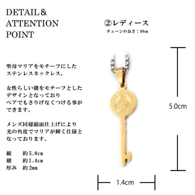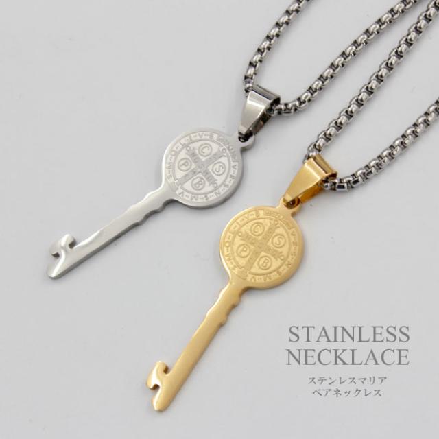 ※付属チェーンはデザイン・チェーンの太さ等、在庫状況により変わります。予めご了承ください。【特徴】鍵モチーフのステンレスネックレスです。鍵の上部には聖母マリアが刻印されています。メンズとレディースで同じデザインでサイズ違いとなっています。金属アレルギーの方にも安心して着用ができる316Lサージカルステンレスを使用しています。