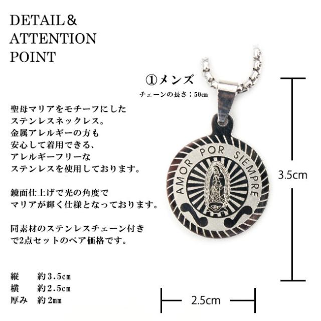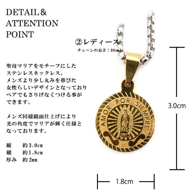 ※付属チェーンはデザイン・チェーンの太さ等、在庫状況により変わります。予めご了承ください。【特徴】聖母マリアをモチーフにしたステンレスネックレスです。メンズはシルバー、レディースはゴールドになっており、同じデザインでサイズ違いとなっています。金属アレルギーの方にも安心して着用ができる316Lサージカルステンレスを使用しています。
