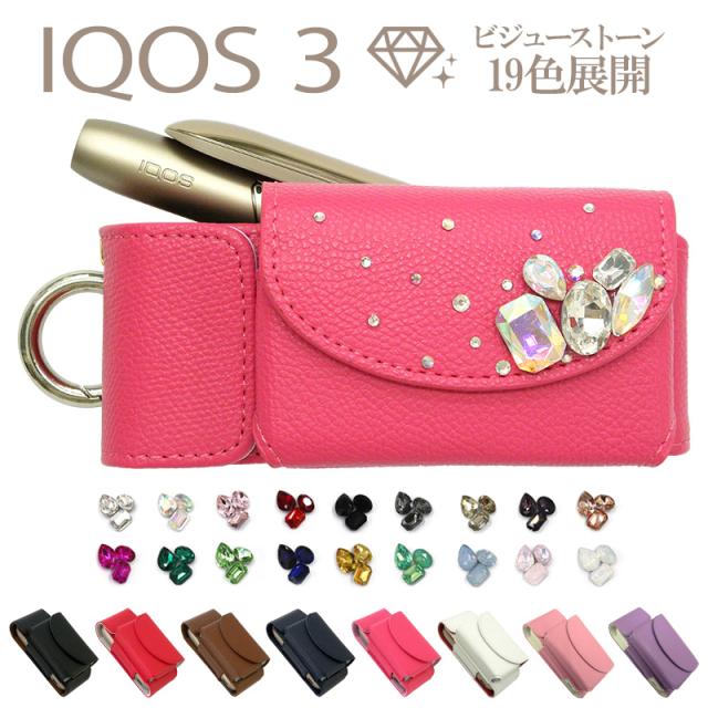 アイコス3 ケース アイコス3ケース【レザータイプ×ビジュー&フラットストーン】極3 アイコス3 カバー ポーチ タバコ たばこ 煙草 禁煙 喫煙 電子タバコ レザー 革 合皮 皮 カラビナ ストーン キラキラ ワンポイント デコ ギフト 新型 カスタム メール便送料無料 受注生産
