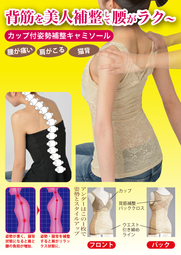 背筋矯正 背筋補整 背筋伸びる 背筋 伸ばす 猫背 インナー補整グッズ 下着 姿勢矯正 猫背矯正 腰痛 肩凝り ウエスト引締め リラックス 負荷軽減 キャミソール 肩こり 解消グッズ 美姿勢 腰らくキャミソール 補正ブラキャミ ブラキャミソール 大きいサイズ