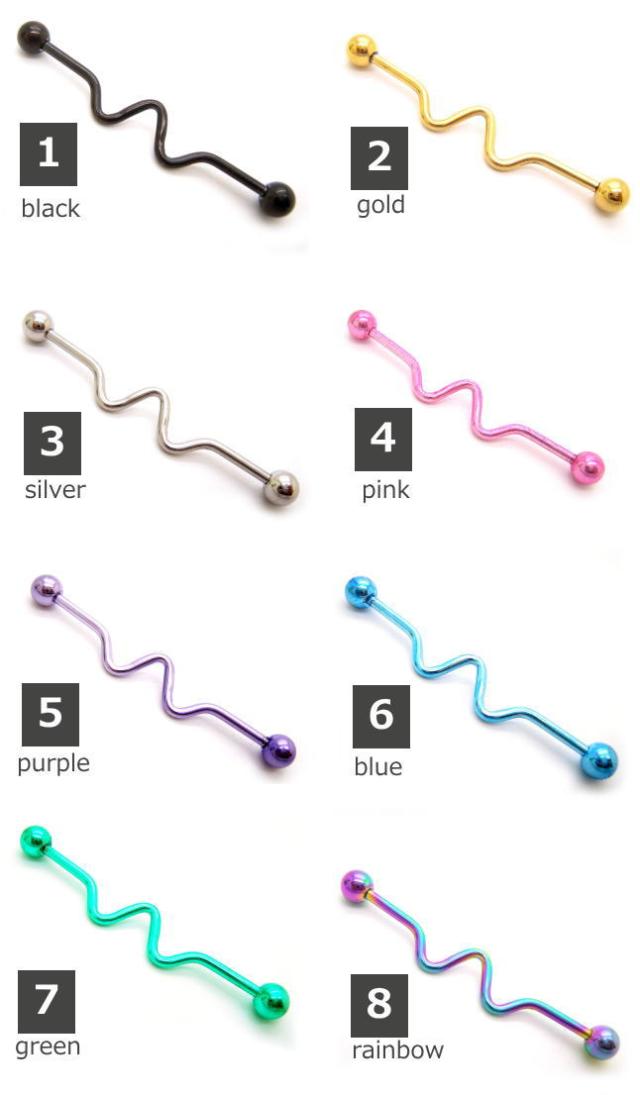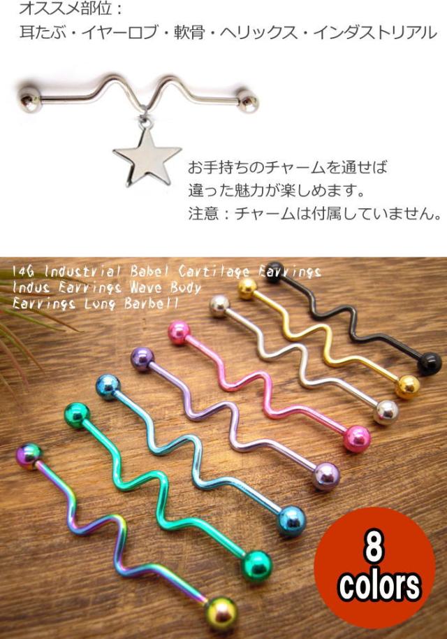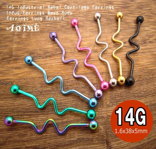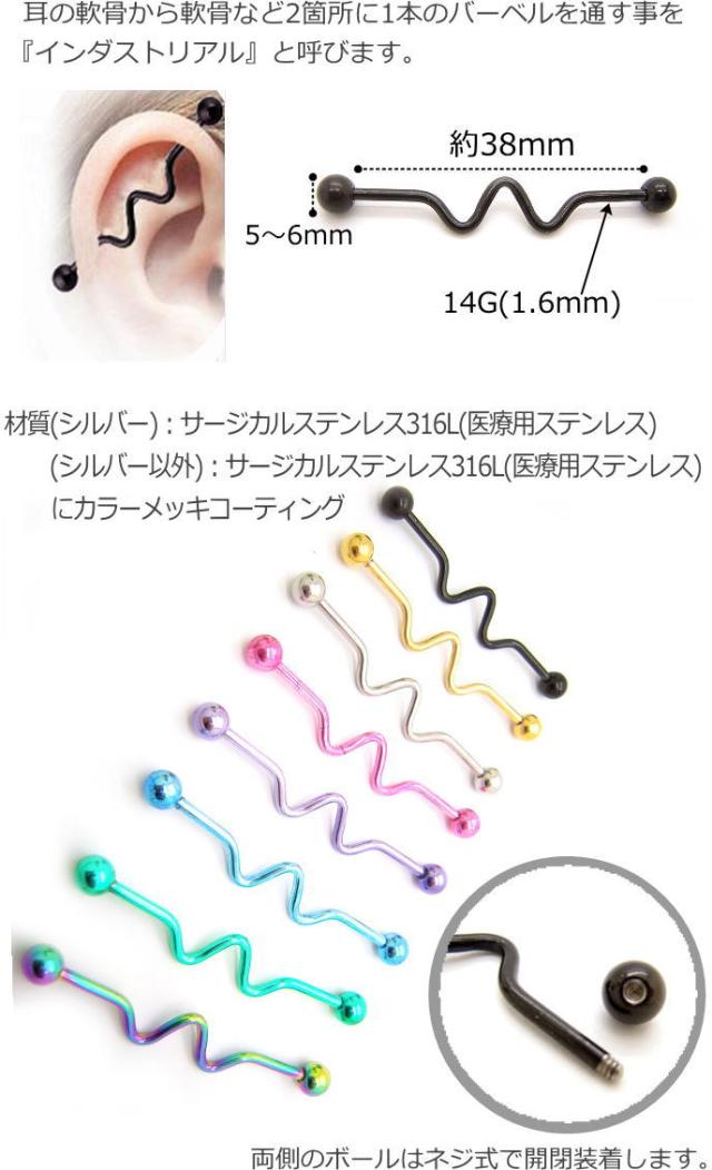 耳の軟骨から軟骨など2箇所に1本のバーベルを通す事を『インダストリアル』と呼びます。スタンダードな長さ38mmなのでオススメ。中央のウエーブデザインが程よく個性的でカラーは8色展開です。
