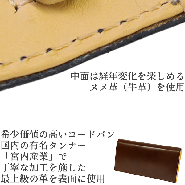 国内の有名タンナー「宮内産業」で丁寧な加工を施した希少価値の高い最上級コードバンをを表面に使用しています。
