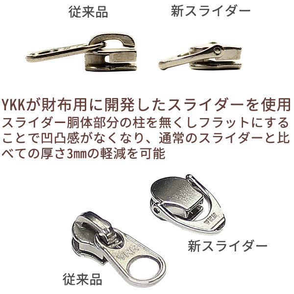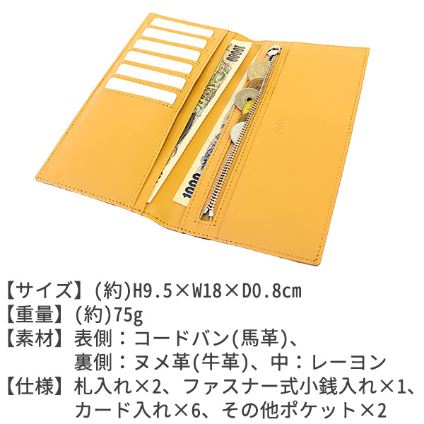 仕様:札入れ×2、ファスナー式小銭入れ×1、カード入れ×6、その他ポケット×2
