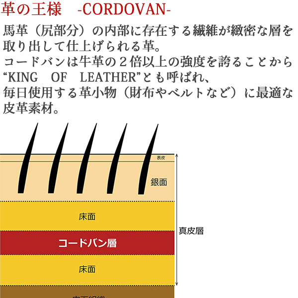 素材:表側/コードバン(馬革)、裏側/ヌメ革(牛革)、中/レーヨン