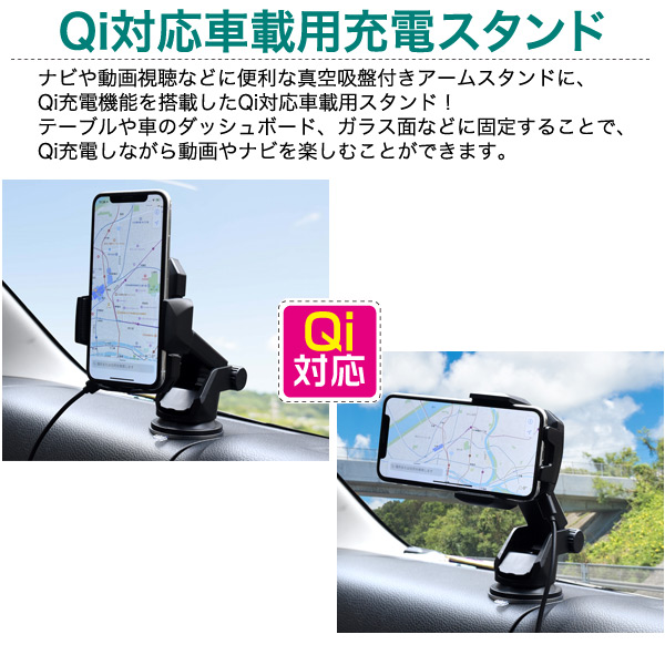 真空吸盤付きアームスタンドに、Qi充電機能を搭載したQi対応車載用アームスタンド!テーブルや車のダッシュボード、ガラス面などに固定することで、Qi充電しながら動画やナビを楽しむことができます。