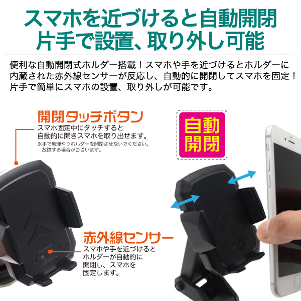 ※手で無理やりホルダーを開閉させないでください。故障する場合がございます。※ケースを付けたままでもワイヤレス充電は可能ですが、素材や厚さによってうまく充電ができない可能性があります。その場合は、ケースを外してご利用下さい。※充電中または正しく機器が置かれていない場合、高温になる場合があります。その際はご使用を控えてください。※水分や湿気の多い場所では、本製品を使用しないでください。 ※必ず強く押してから吸盤を装着してください。※素材によっては装着できない場合がありますのでご了承ください。※使用中の落下による周辺機器・スマートフォン本体の破損等の補償は致しかねますので、 取り付け箇所等には十分ご注意ください。