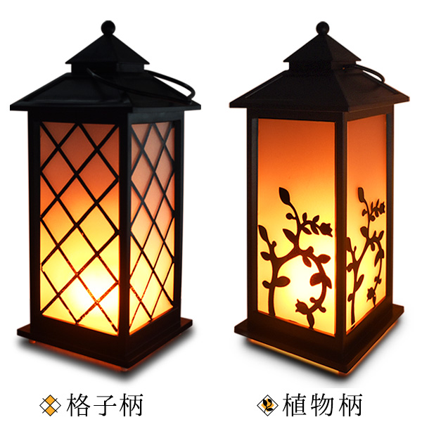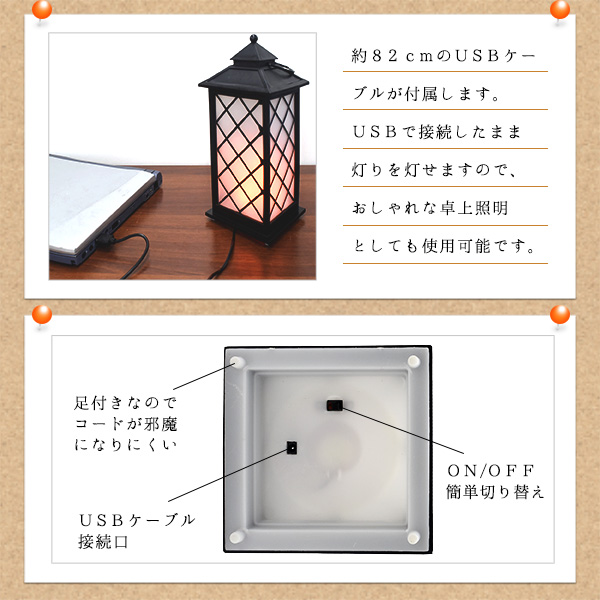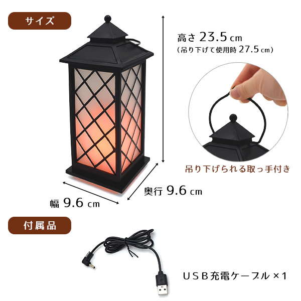 ランタンの中で、まるで本物の火が灯っているかのように灯りがゆらゆら揺れるLEDランタン。LEDなので火傷の心配もなく安心・安全にお使いいただけます。 便利な充電式なので、面倒な電池交換は不要です。本体の充電も付属のUSBケーブルで簡単にできます。 約82cmのUSBケーブル付属。接続したままの卓上照明としても使用可能です。 雰囲気を演出してくれるので、お部屋のインテリアや 店舗ディスプレイの小道具として最適です。また、取っ手が付いているので吊り下げてご使用も可能です。 スタンダードでおしゃれな格子柄と、レトロな雰囲気がかわいい植物柄の二種類からお選びいただけます。