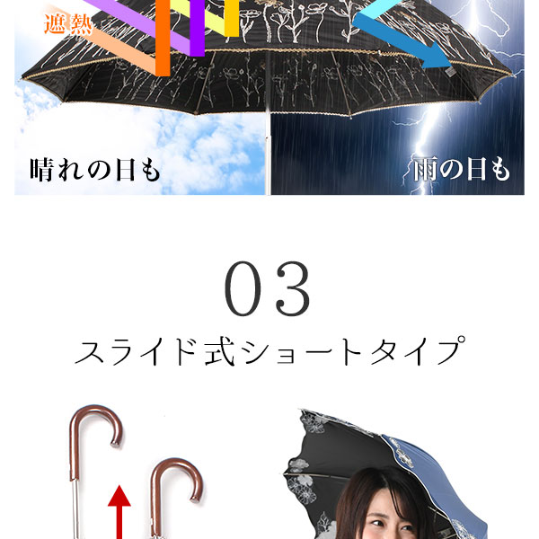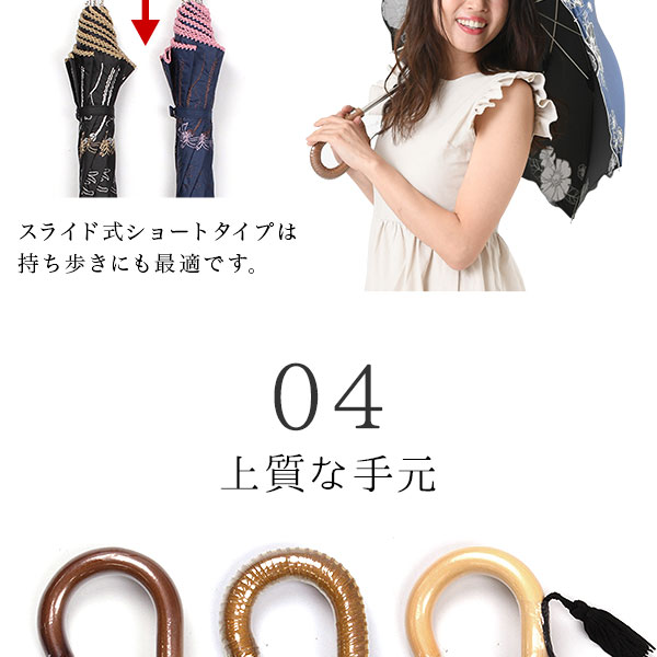 ■完全遮光・UVカット率99%以上。スライド式ショートタイプが便利で上品な日傘。