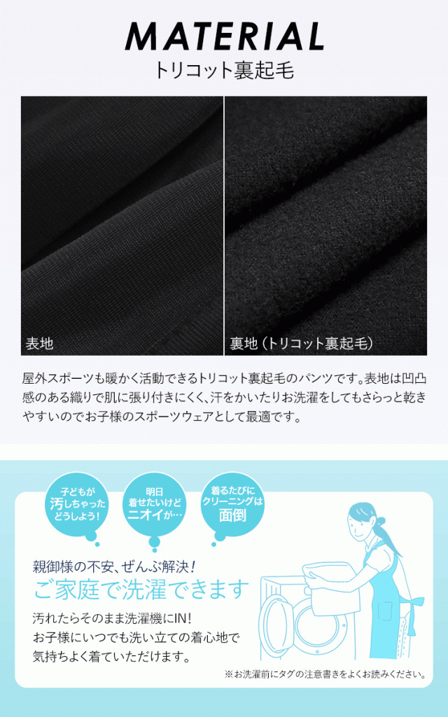 サイドのWラインがクール♪ダンスやスポーツが楽しみになるストレスフリーな着心地です。屋外スポーツも暖かく活動できるトリコット裏起毛を使用しており、表地は凹凸感のある織りで肌に張り付きにくく、汗をかいたりお洗濯をしてもさらっと乾きやすいのでお子様のスポーツウェアとして最適です。