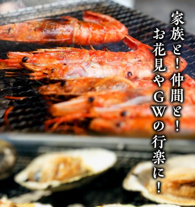 バーベキューに便利で美味しい赤海老、イカ一夜干し、殻付きホタテ、三重県鳥羽のブランドかき桃こまちをお得なセットにしました。