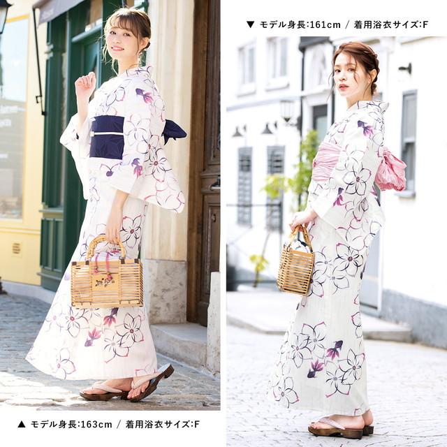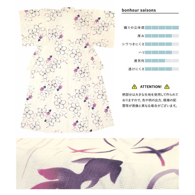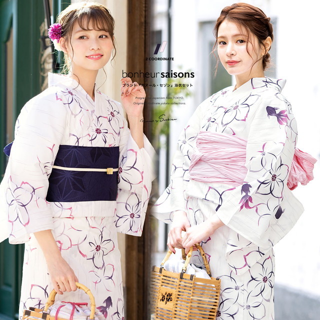 浴衣セット レディース 浴衣セット 作り帯 大人 3点セット(浴衣/帯/下駄) bonheur saisons ボヌールセゾン 白系 アイボリー 紫 紺 桜 サクラ 花 雨縞 金魚 綿 夏 花火大会