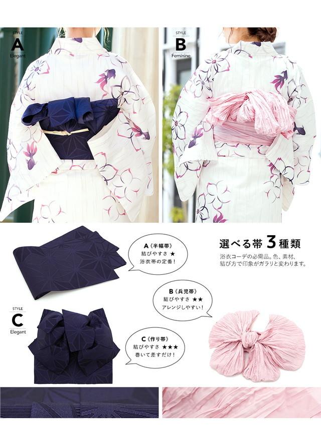 帯は、体に巻いて後ろで結ぶタイプの半幅帯と兵児帯、または作り帯からお選びいただけます。モデル着用は半幅帯です。