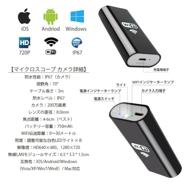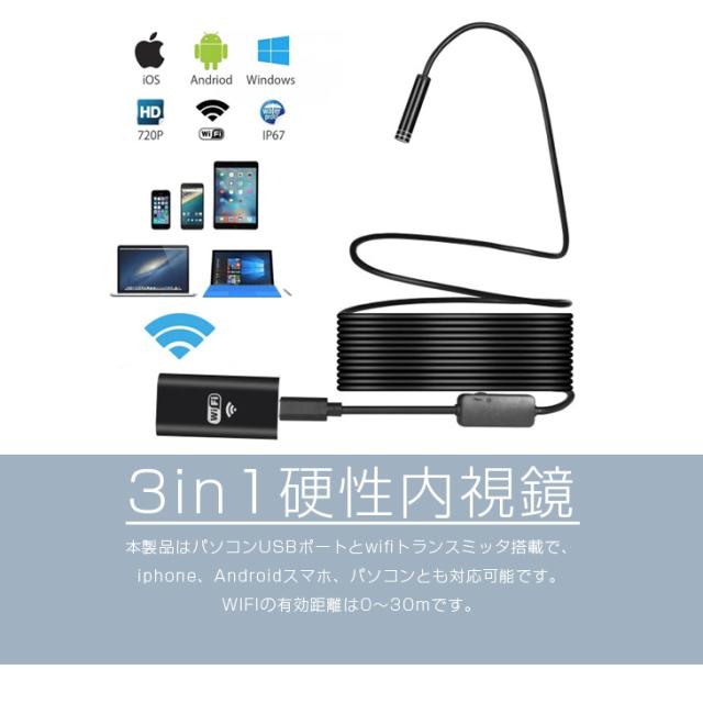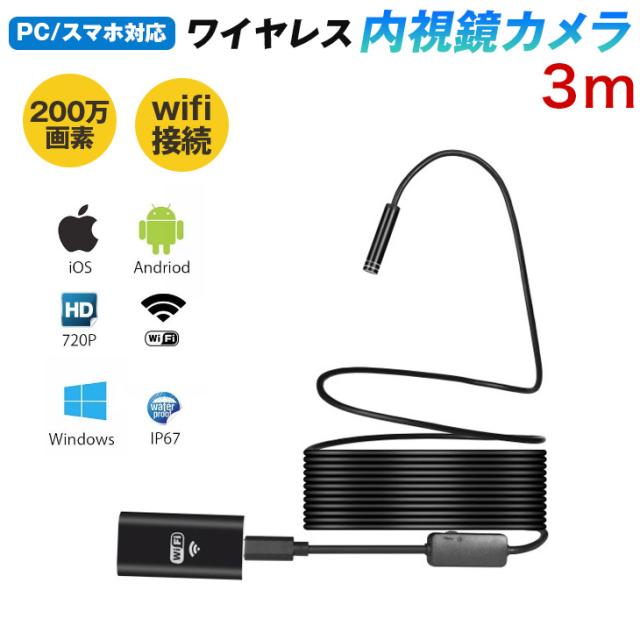 【送料無料】ワイヤレス 内視鏡カメラ 200万画素 3m スマホ PC対応 wifi接続 ファイバースコープ 8mm極細レンズ 録画可能 IP67防水