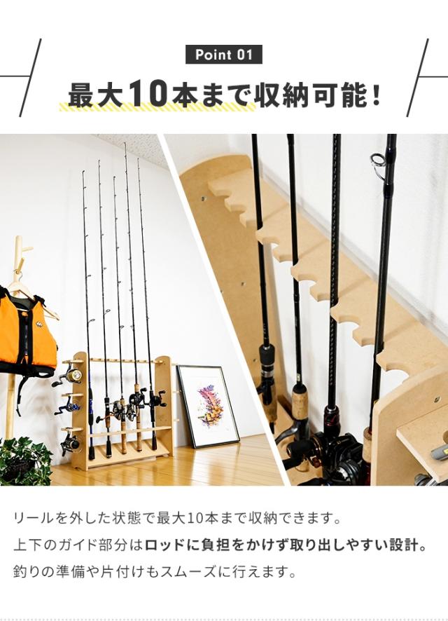 釣竿ラック 10本収納可能 ロッドスタンド ナチュラル 無塗装 幅76.5 奥行15 高さ65 釣り竿収納 釣竿 スタンド 釣竿 収納 釣り竿 つりざお 10本収納 リール掛け おしゃれ 木製 日本製 釣竿立て 収納棚 釣り竿スタンド