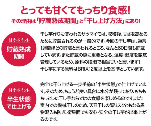 - 期待以上の美味しさでした。大量袋で購入すると硬いのやら甘くないものも混ざっている事が多いですがこちらの干し芋は均等に美味しいです。食べ過ぎそうで困っている。でも購入してよかったです。