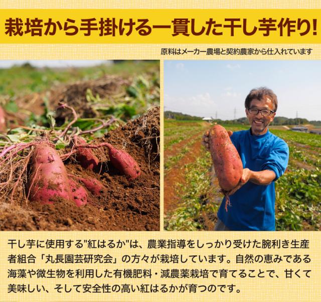 さつまいもは収穫してから30〜40日間貯蔵して糖度をあげてから加工に使うのが普通です。しかし、この干し芋の原料は60日間とかなり長い時間貯蔵しています。そうすることで紅はるかそのものの甘味や、旨味を最大限まで引き出しました。芋の長期貯蔵は約15℃、糖化には約10℃が適しています。60日間で最大限糖化させるために傷みのリスクを考慮し、長年培った技術によって低温貯蔵しています。