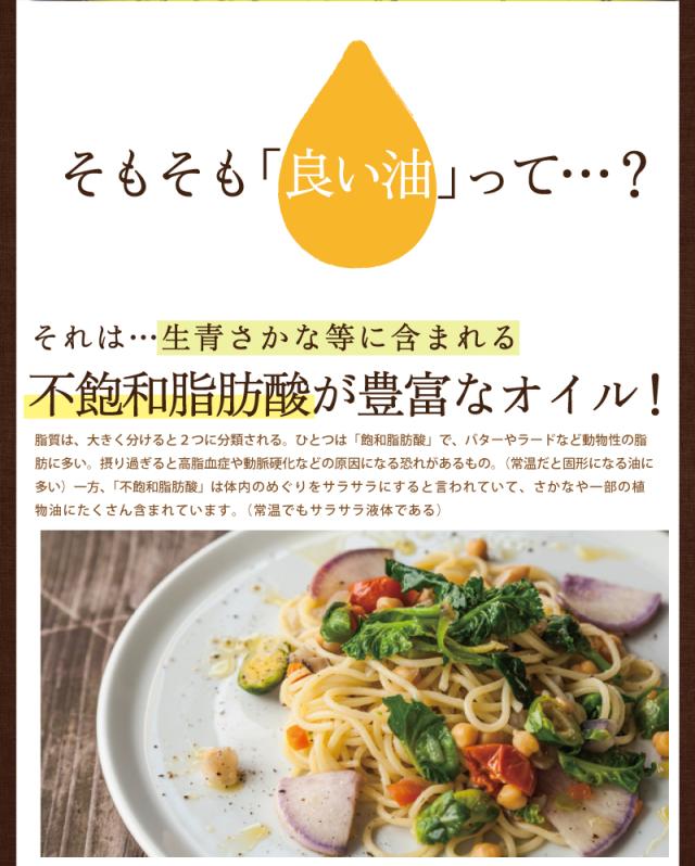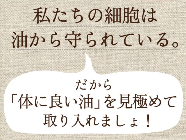 良い油をとると、体の巡りやお肌づくりもスムーズになり、すべてが良いサイクルに。えごま油には、青魚にも多く含まれる、体をつくるうえで欠かせない油「オメガ3脂肪酸(α-リノレン酸)」がたっぷり。サラダなどにかけて生でとるのがオススメです。一番しぼり最高級エゴマ油