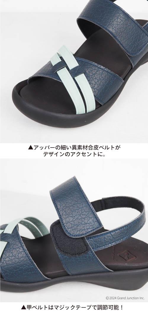 ■斜めに入る2本の細ベルトが特徴的なアッパー。素材を変えることによってさらにお洒落感をUPさせています。足首側のアッパーはマジックテープ調整でき、かかとストラップはゴム切替でしっかりと 足とサンダルをホールドします。