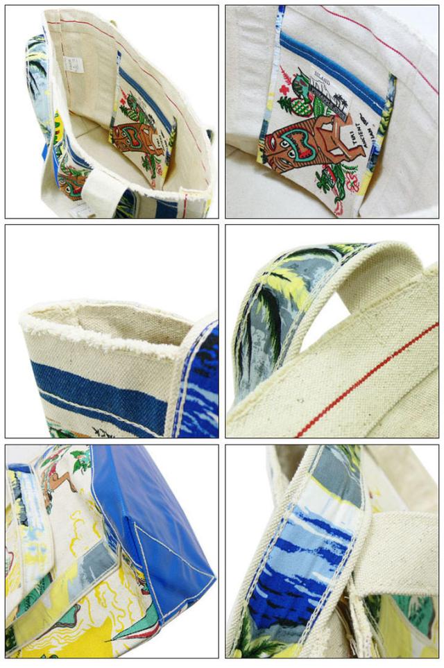商品番号:"pj1199004"本場ハワイ発のブランドPineapple juice。リゾート地へのお出かけにもおしゃれで便利なトートバッグ。取っ手部分は鮮やかなハワイアン模様。全体の柄はハワイアン度満載のトーテムポール。切りっぱなしのようなデザインも魅力的です。縫い目のひとつひとつも丁寧で、中糸も赤色にチェンジしてあってアクセントになっています。しっかりめの生地なので重いものでも安心ですね。中にはポケットもついているので、ティッシュや小物入れにもお使い頂けますよ。これくらいのサイズだとちょっとしたお出かけにとても便利です。ブランド:PINEAPPLE JUICE【パイナップルジュース】Pineapple Juiceはクラシック・ヴィンテージアロハシャツの復刻を得意とするアロハシャツブランドです。オリジナルのヴィンテージアロハシャツは、ハワイの黄金時代を象徴する芸術品。その収集家であるハワイ3世のSparkyDooが、その復刻に創作意欲を掻き立てられて創設したのがこのブランドです。