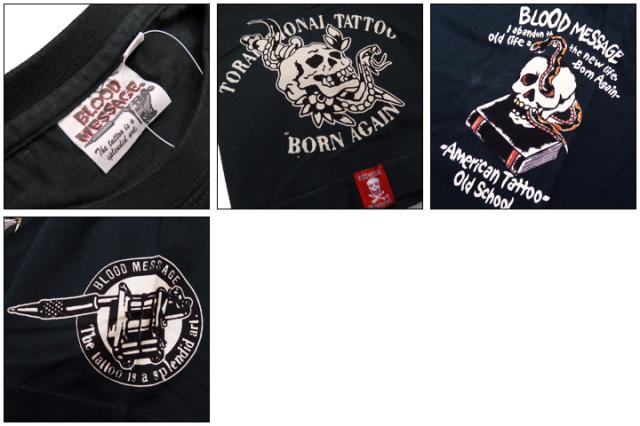 ![]() | 『BLOOD MESSAGE』とは「血のメッセージ」という意味です。このレーベルは「着る人へ強烈なるメッセージを込めたデザインを!」というコンセプトのもとリリースされました。モチーフはTATTOOのオールドスクール、ニュースクールなどから意味を得て、手描きで起こしてから製作に入っています。本来、体に直接描かれるTATTOOはそのデザイン一つ一つに意味を持ち、刺す者の覚悟が絵柄になって表現されたものです。BLOOD MESSAGEは体から服にキャンバスを置き換え、着る人へ強烈なるメッセージを発信していきます。 |