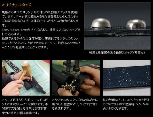 | 国内専属工房で熟練の職人が100%手作業で製作する究極のクオリティー! 職人がひとつひとつ丁寧に作り上げた馬革「ワックスバットレザー」によるロングウォレット。 オリジナルで型から作ったコダワリの鉄スタッズが撃ち込まれています。 欠品している場合でも受注生産可能ですが、フラットヘッドのレザーアイテムはとても人気が高いうえ、 すべての工程を手作業で製作する為お届け納期が約半年待ちという、とてもレア度の高いアイテムです。 iPhoneシリーズがちょうど収まる大きさで、バッグやベルトに通して使用可能。 スタッズで電話を傷つけないように、裏もしっかり革が貼られています。 もちろん電話以外にもタバコなど、様々な用途に使えます。 <ワックスバットレザー> ストックバーグで作られるアイテムの中でも大変希少価値の高い4ミリ厚のバットレザーがあります。 (馬革のお尻部分)コードバン層を含む馬革は通常2ミリ未満の物ですが、4ミリを超えるバットレザーとなると、 タンナーの抱えている皮革の中でも大変希少価値の高い素材です。 コードバンと異なるのは、銀面(革の表面)を削り取らず、そのまま仕上げている点です。 その為、銀面にある馬識別用のブランド印がそのまま残っていることや、血筋、シワの表情をそのまま感じ取ることが出来ることで、 他では味わえない重厚感のある革を作り出してくれます。 コードバンと同じプロセスを経て熟成・なめしが行われる為、非常に味わい深く仕上がっています。 十分にオイルを含ませた革に染料染めをした後、グレージング仕上げを施すバットレザーは繊維の締まった堅さの中に 柔軟性とコシ感のある革にしあがっているため、独特の風合いを楽しむことが出来ます。 | |
